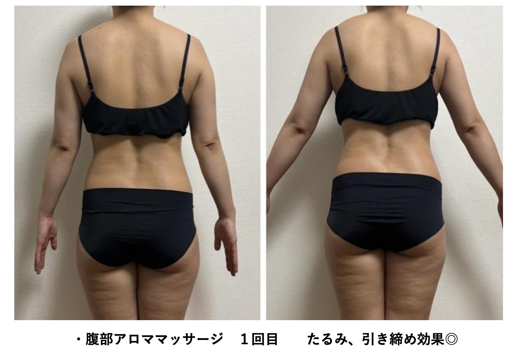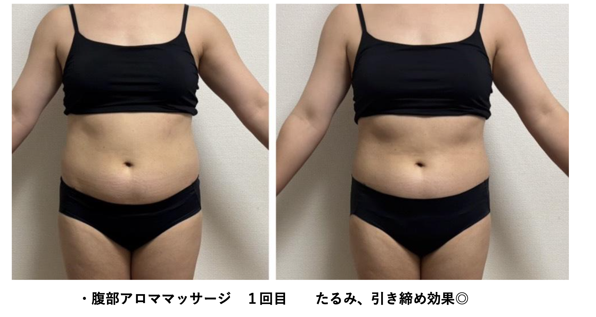 実際に腹部へのアロママッサージを1回行った際のBefore & Afterでは、たるみの改善と目に見える引き締め効果が確認されています。